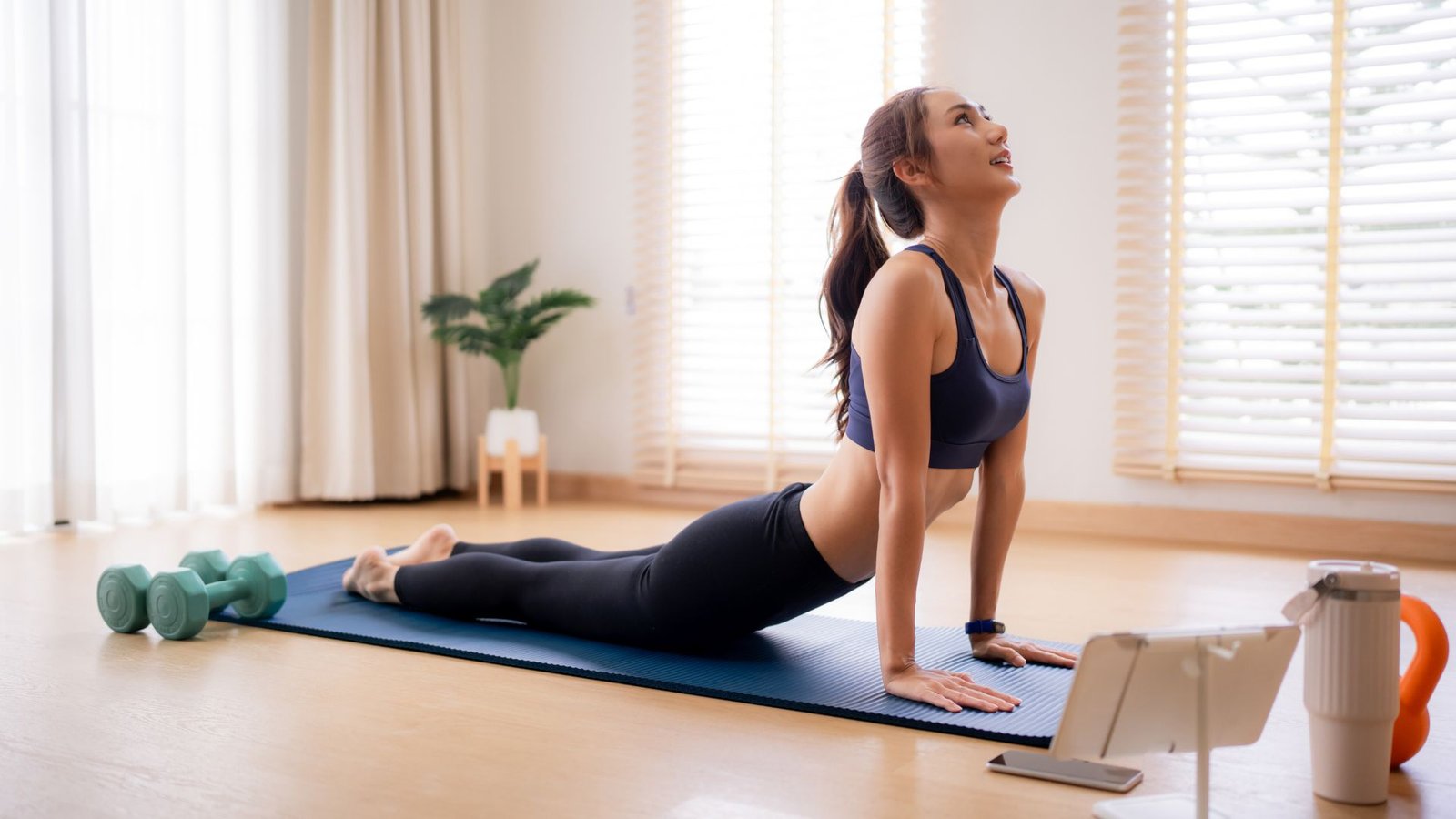 Soulevez graduellement la tête ensuite le tronc jusqu’au bas du dos en vous allongeant et en poussant avec vos bras tout en relâchant les fesses et en gardant le bassin au sol.