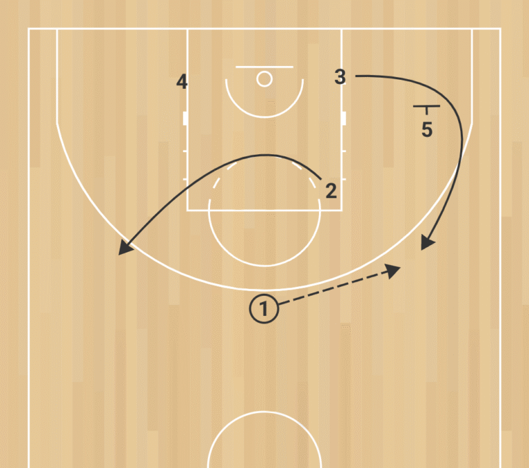2 effectue une coupe vers le panier avant de remonter à l’aile pour écarter le jeu. Pendant ce temps, 3 utilise l’écran de 5 pour se libérer à la ligne à trois points. 1 profite du mouvement pour faire la passe à 3, désormais ouvert pour un tir extérieur.