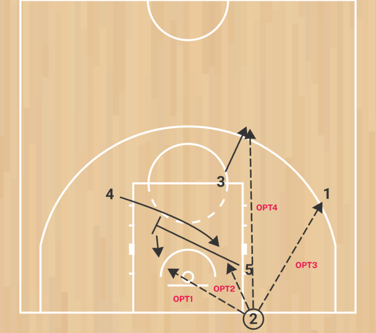 5 monte poser un écran pour 4, puis s’ouvre rapidement vers le ballon, en scellant son défenseur dans le dos. 3, de son côté, remonte derrière la ligne à 3 points pour devenir une option extérieure claire. À ce moment, 2 lit la défense et dispose de quatre options de passe : Option 1 : passe intérieure à 5, s’il a l’avantage au poste bas. Option 2 : passe à 4, s’il se libère après l’écran de 5. Option 3 : passe à 3, ouvert en périphérie. Option 4 : passe à 1, si la défense surjoue les premières options.